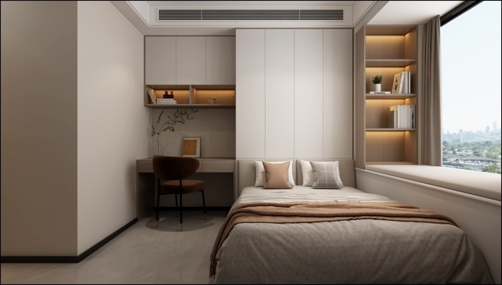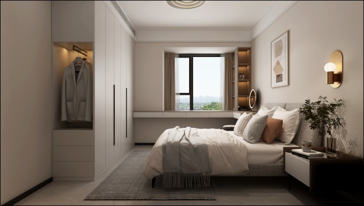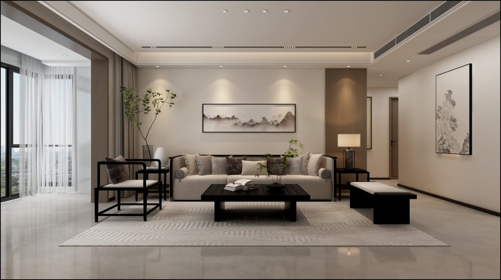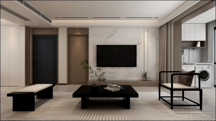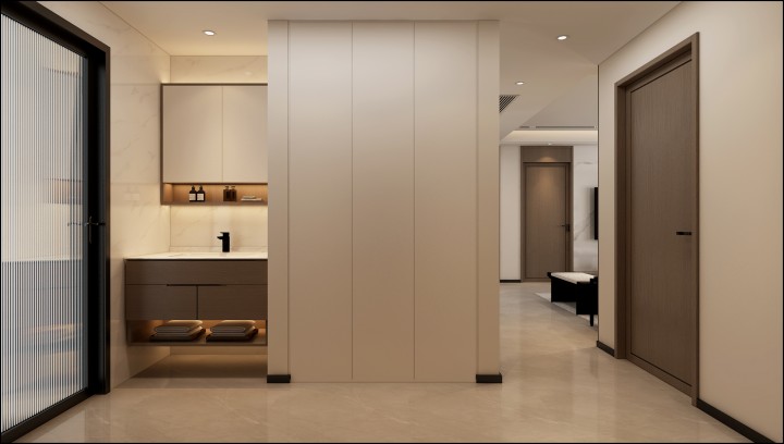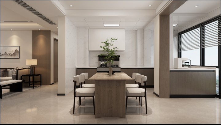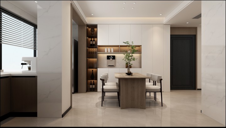 设计理念:本案作为婚房,父母一起住,极简新中式,满足了两代人的需求。以朴素的米色为主调,简约的布置,打造出高雅而休闲的氛围,让人一眼就能感受到现代中式美学的魅力。沙发墙的山水水墨画,如诗如梦,仿佛穿越万象,置身于大自然的山川江河。打掉厨房和餐厅之间的墙体,使得空间视觉更大、更亮堂。米白的柜面,简约而不失美感,如同东方的留白,给人留下无限的想象空间。线条简洁而富有现代感,去除了一切冗杂之感。