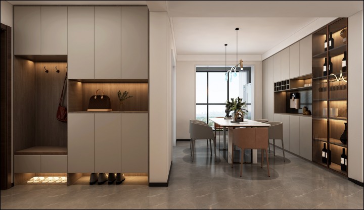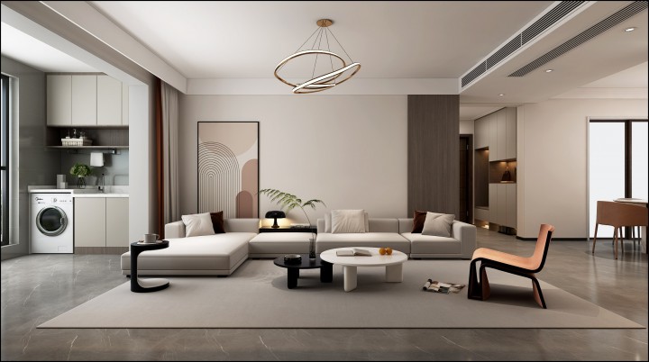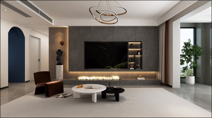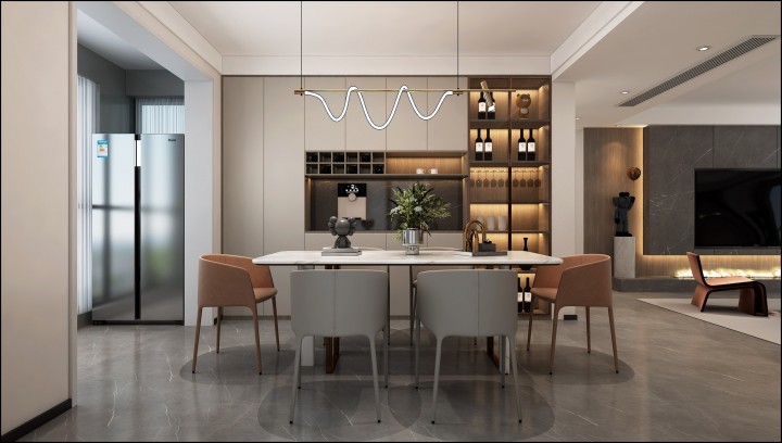 设计理念:整体设计基调沉稳内敛,温暖精致的暖咖色调,打造温馨舒适的居家氛围,布艺金属和石材三种材质碰撞,融合出简约质感。搭配意式轻奢的灯具,空间舒爽通透,干净又层次。背景墙设计采用岩板+黑色不锈钢的电视墙则展示了现代简约的设计美感。电视内嵌,增加了空间的整洁感,让整个客厅更加耐人寻味。餐厅贴墙打造餐边柜,实用有质感。